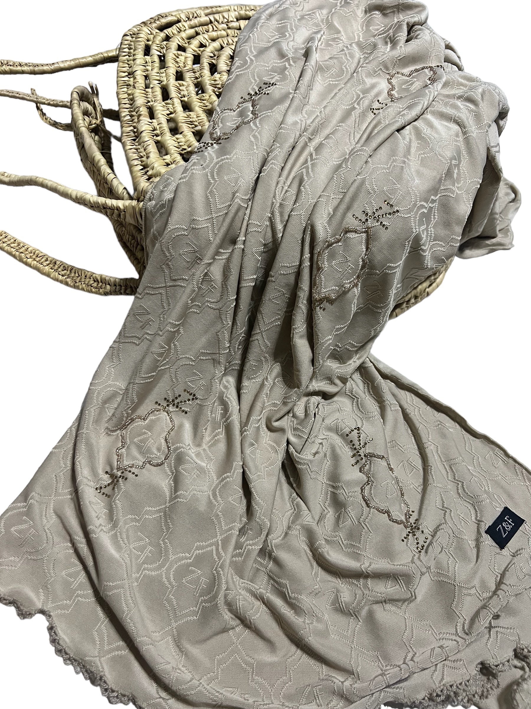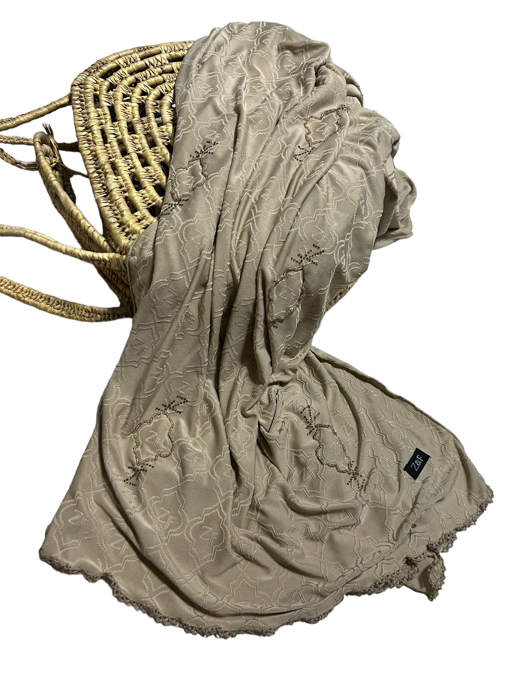 The Z&F scarfs are made from a soft jersey fabric with just the right amount of thickness. This fabric falls perfectly in place and stays beautiful after long time use. These scarfs can even be worn without a underscarf or pins.