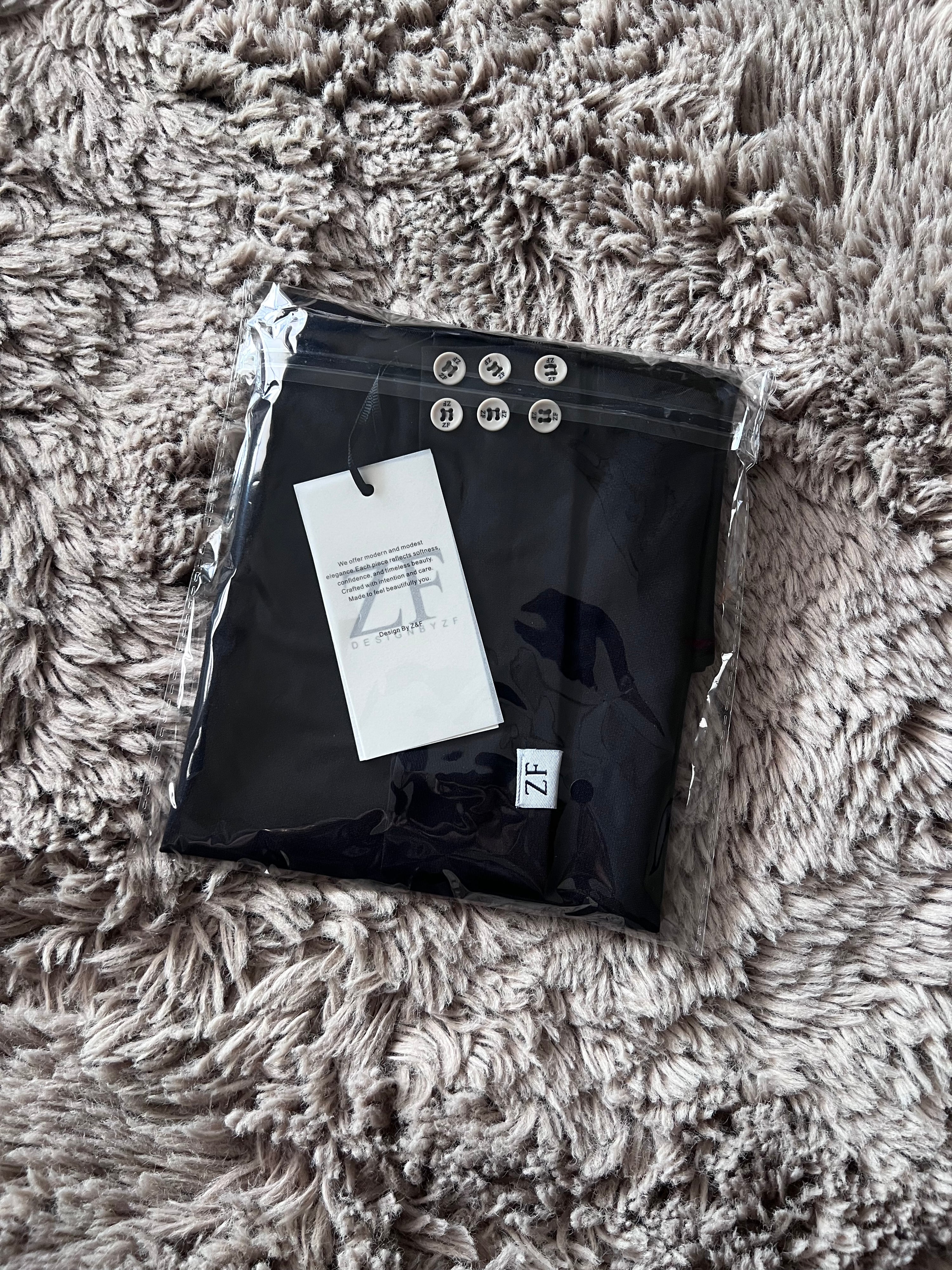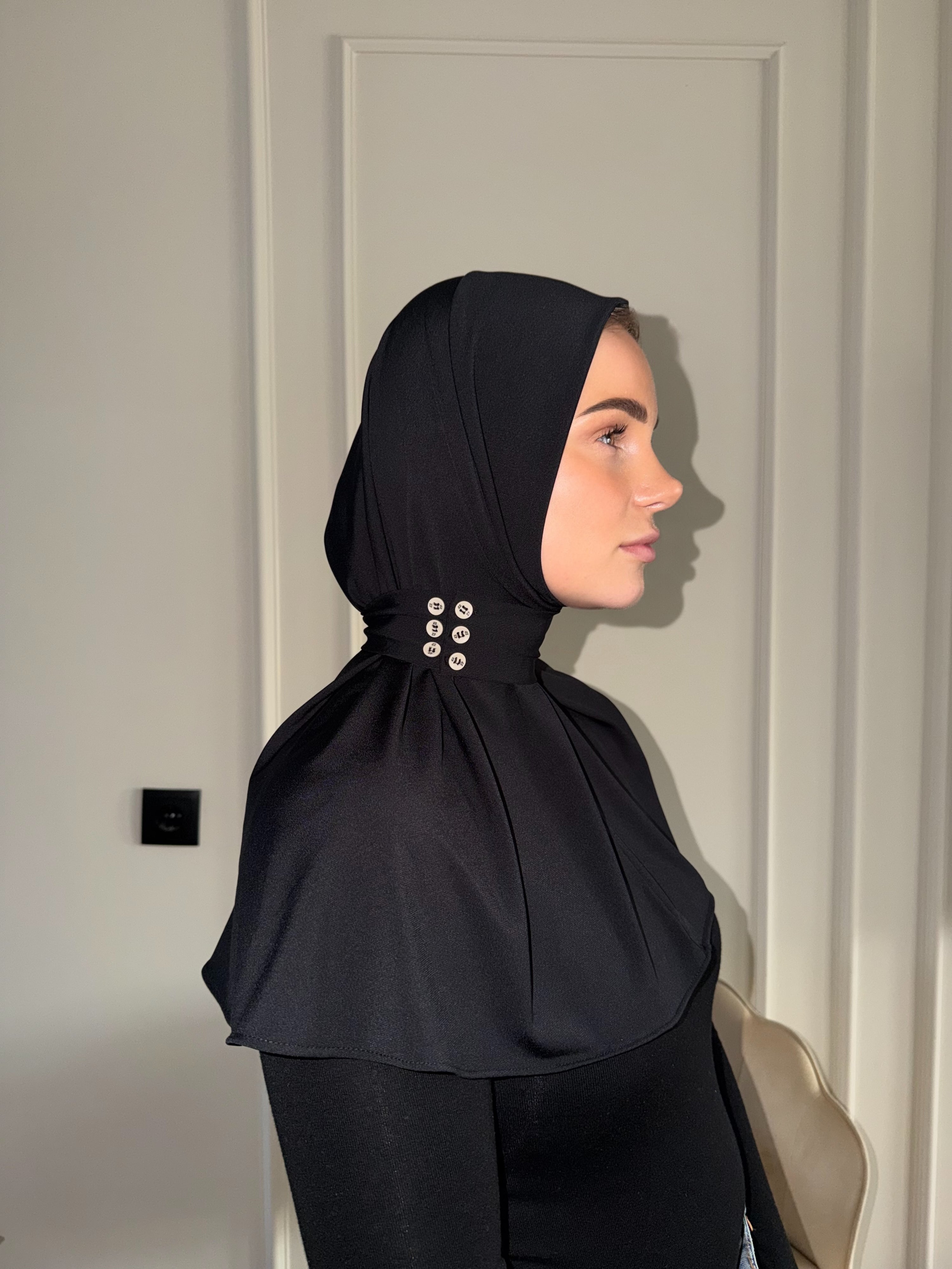 Deze instant hijab combineert comfort en stijl in één ontwerp. Dankzij de extra lengte en de zachte, rekbare stof valt hij moeiteloos mooi. De afneembare band met dubbele knopenrij zorgt ervoor dat je de pasvorm en styling volledig naar wens kunt aanpassen. Het subtiele logo geeft de hijab een moderne, minimalistische uitstraling. Liever zonder band? Draag hem los in je top voor een effortless look.